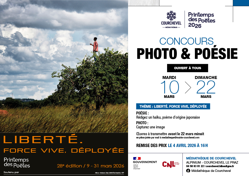 Dans le cadre du Printemps des Poètes 2026 sur le thème : “Liberté. Force vive, déployée”, la médiathèque de Courchevel organise la 4e édition de son concours photo & poésie. Ouvert à toutes et tous, les participants peuvent concourir pour la catégorie poésie ou photo, ou dans les deux, en se limitant à une seule proposition par catégorie.